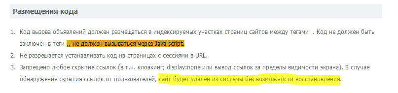 Запрещено любое скрытие ссылок (в т.ч. клоакинг; display:none или вывод ссылок за пределы видимости экрана). В случае обнаружения скрытия ссылок от пользователей, сайт будет удален из системы без возможности восстановления.