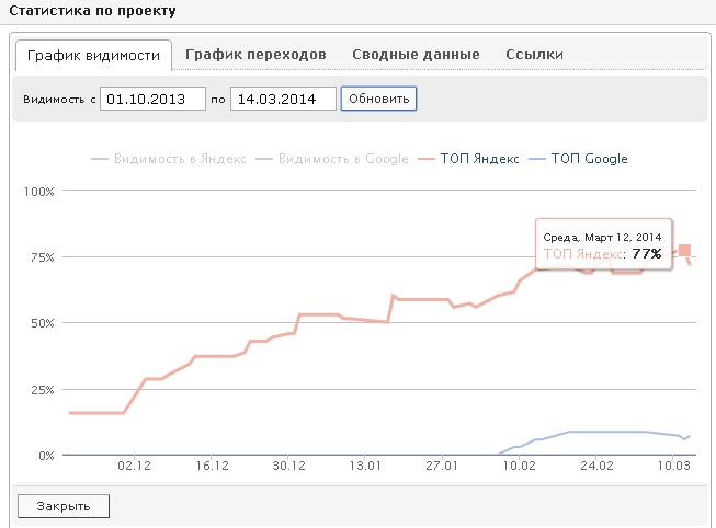 ТОПы (количество слов на первой странице) сайта по словам первой группы увеличилась с 12% до 77% слов вышло на первую страницу результатов поиска Яндекс. В Google, сайт вовсе отсутствовал, в последние месяцы он стал появляться и в этой поисковой системе.