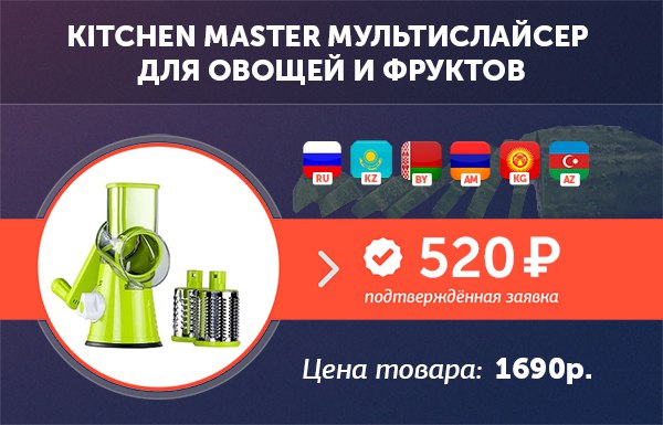 2) Kitchen Master мультислайсер для овощей и фруктов - Удобный и безопасный мультислайсер для овощей и фруктов. Мгновенная шинковка, идеально ровные кусочки и максимальная простота в использовании сделали это устройство популярным во всем мире! Оффер отлично заходит из "возрастных" пабликов ВК и ОК, а также МТ и РСЯ на преимущественно женскую аудиторию 36-60 лет.