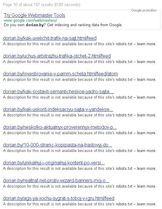 В индексе гугла есть вот такие страницы. В роботс.txt они запрещены к индексации, но гугл все равно почему-то держит их в индексе и в соплях. Причем гугл сам в дескрипшене пишет что страницы закрыты от индексации, но почему-то индексирует их...