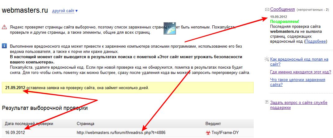 Яндекс периодически проверяет страницы сайтов. Последняя проверка (менее недели назад) показала, что на сайте размещён вредоносный код. Это могло произойти как по желанию владельцев сайта, так и без их ведома — в результате действий злоумышленников. Если при следующей проверке код не будет обнаружен, Яндекс перестанет размечать сайт в результатах поиска как опасный.