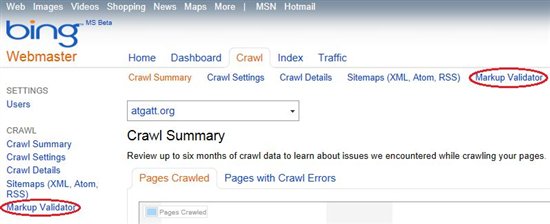 Для доступа к этой функции нужно после авторизации в Bing Webmaster Tools зайти на вкладку “Crawl”. Справа последней ссылкой будет как раз “Markup Validator”.