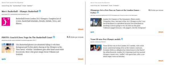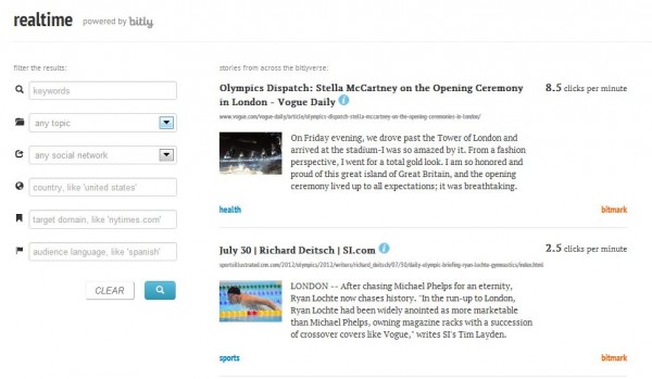 Популярный сервис сокращения URL и создания закладок bitly представил “realtime” – поисковик, работающий в режиме реального времени, и предоставляющий данные о кликах пользователей по многочисленным социальным сетям (таким как Twitter, Facebook, tumblr, ameblo и Linkedin). Фильтровать результаты поиска можно по теме, запросу, региону, языку или домену.