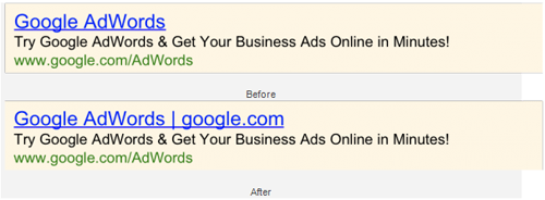 Google начал показывать в заголовках объявлений AdWords домен целевой страницы, по заявлению представителей компании, урл показывается только в топовых объявлениях (спецразмещение над органической выдачей).