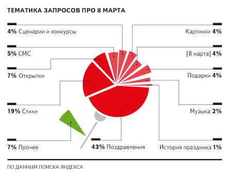 | | Команда Яндекс:Поиска проанализировала пользовательские запросы перед женским праздником и у них получился очень интересный отчет. Оказывается, что в течение года пользователи очень мало ищут что то с названием "8 марта" (диваны или название улицы), зато за неделю перед праздником поиску Яндекса задают около 10 миллионов таких запросов.  Это очень много – даже на предновогодней неделе задают ненамного больше запросов про новый год – около 13 миллионов. Чаще всего пользователи ищут поздравления и открытки – им посвящены две трети запросов. Подарки ищут намного реже. Это неудивительно - подарки дарятся лишь небольшому кругу близких, а поздравлениями можно порадовать всех прекрасных знакомых. Очень часто пользователи ищут не конкретные подарки, а идеи для самих подарков. Больше всего ищут идеи подарков для мам (около 4500 запросов в сутки) и девушек (около 3500 запросов в сутки). Следом за ними с большим отрывом следуют подарки для любимых, жен и бабушек (500-700 запросов в сутки). Подарки для свекрови ищут примерно в пять раз чаще, чем для тещи (400 запросов против 75). Судя по всему, эта удивительная статистика проливает свет на состав дарителей: подарки для мам и бабушек ищут дети, а для жен, девушек и любимых – мужчины. А самое увлекательное в поисковых запросах – это те истории, которые они в себе несут. Некоторые запросы выразительнее целого рассказа: [с чего начали праздновать 8 марта?], [ролик к 8 марта о нелёгком труде женщины синхронное плаванье], [я ведущая концерта к 8 марта как провести концерт?], [эмо ненавижу 8 марта], [шикарные поделки из бумаги к 8 марта], [я хочу подарить маме подарок что предложите на 8 марта только чтоб это было недорого я ребёнок], [тёплые но короткие стихи в 8 марта], [стихи чтобы подарить микроволновку на 8 марта], [рады ли мужчины 8 марта], [электрические подарки на 8 марта], [я не буду пить восьмого марта], [что ценить в мужчине в канун 8 марта], [что значит получить в подарок на 8 марта набор вешалок], [узоры из продуктов на 8 марта], [что свалять в подарок на 8 марта], [яичница в виде восьмёрки на 8 марта], [суровые открытки на 8 марта] и многие другие. |