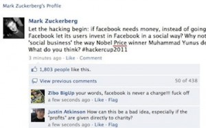 | | TechCrunch пишет, что 25 января хакеры взломали фан-страничку основателя Facebook, человека года Марка Цукерберга. Вчера вечером на ней появилось странная запись со следующими словами:  «Пусть начнется хаккинг: Если Фейсбуку нужны деньги, то почему вместо того, чтобы ходить по банкам, социальная сеть не позволит пользователям инвестировать в нее свои деньги? Почему не трансформировать Фейсбук в «социальный бизнес», о котором писал Нобелевский лауреат Мухаммед Юнус? Что вы об этом думаете? #hackercup2011″ Пока не известно, кто написал это странное сообщение, но уже за несколько часов оно собрало 1800 лайков и около 500 комментариев Ясное дело, что запись сделал не Цукерберг, потому как вскоре всю страничку молодого миллиардера заблокировали. PR-служба соц. сети пока не дает никаких заявлений. Но то, что объяснений жаждут 600 миллионов юзеров, в этом нет сомнения |