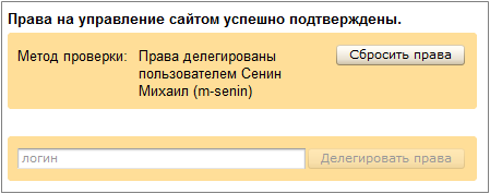 Процедура делегирования прав на сайт доступна в разделе «Мои сайты», «Права на управление». Нужно лишь добавить яндексовский логин пользователя, кому передаются права.