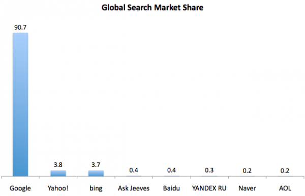 По данным StatCounter, Google принадлежит практически 90 % общемирового поискового рынка, хотя в разных странах доля отличается.