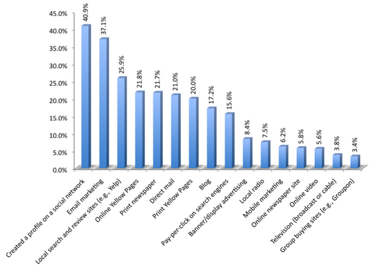Когда бизнесменов спросили, какие маркетинговые каналы они больше всего используют, самым популярным был ответ «создание профиля в социальной сети» (40.9% респондентов). Таким образом, социальные сети как маркетинговый канал вдвое популярнее традиционных газет (21.7%), печатных «желтых страниц» (20%) и местного радио (7.5%). Также соцсети обошли и другие онлайновые маркетинговые возможности – email-маркетинг (37.1%), локальные сайты отзывов (25.9%) и интернет-«желтые страницы» (21.8%).
