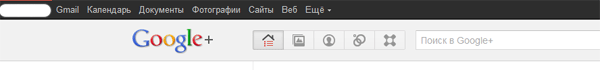 Как видно из скриншота, под логотипом Google+ появляется небольшой треугольник, который открывает выпадющее меню, в котором на черном фоне предлагаются различные логотипы сервисисов Google, в том числе почты, поиска и др.