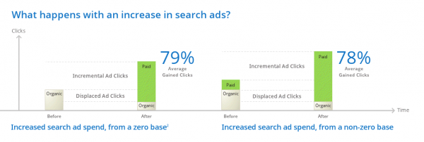 | | Несмотря на то, что многие маркетологи понимают SEO и контекстную рекламу как взаимодополняющие типы продвижения в поиске, многие наверняка задумывались о том, что же будет, если приостановить покупку объявлений CPC. В июле прошлого года компания Google представила исследование, которое показало, что 89% трафика, генерируемого поисковой рекламой, не замещается кликами с органической выдачи в случае остановки рекламной кампании. Теперь компания опубликовала апдейт к предыдущему исследованию, расширив количество рекламодателей и протестировав больше сценариев.  Практически не изменилось положительное влияние контекстной рекламы на органический трафик. На этот раз исследователи получили данные о том, что после остановки рекламной кампании количество рекламных кликов снижается на 85%. При этом трафик с органического поиска несколько возрастает, но не настолько сильно, чтобы покрыть потери платных кликов. Если же рекламная кампания не полностью останавливается, а лишь снижается ее бюджет (правда, в исследовании не сказано, насколько сильно), суммарное число кликов (с коммерческого и органического поиска) снижается на 80%. Google посмотрел и на обратную сторону монеты, если начать снова покупать рекламу после периода полного отсутствия рекламы. Исследователи обнаружили, что суммарное количество кликов вырастает на 79%. |