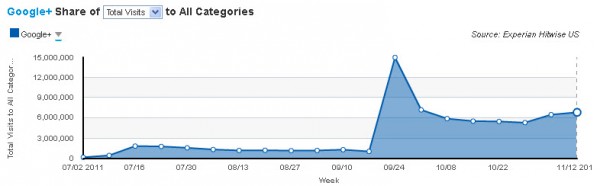 Более высокие показатели трафика на G+ были зафиксированы лишь в первые две недели после начала открытой регистрации пользователей. Очевидно, что скачок посещаемости на прошлой неделе связан с запуском очень важных для бизнес-страниц функций, которые связали их с поиском Google.