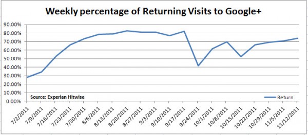 Доля вернувшихся пользователей тоже начала расти. В первые две недели ноября по сравнению с первой половиной октября этот показатель увеличился на 18%. Причем на прошлой неделе, которую мы уже назвали третьим пиком посещаемости G+, 74% трафика составили как раз вернувшиеся посетители. Это значит, что пользователи соцсети, которые ранее лишь опробовали функции G+, начинают возвращаться и взаимодействовать со своими кругами.