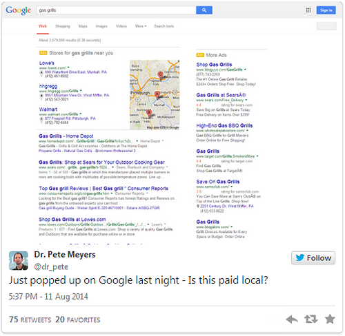 Google готов активировать платные локальные размещения в общем поиске. Такое заключение можно сделать на основании фотографии выдачи, выложенной пользователем поисковика в Twitter: