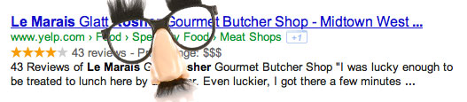 Поясним, что вебмастера просто добавляют любую известную разметку, и если она будет принята Google, такие поддельные сниппеты появятся в выдаче. Например, Google легко обмануть в сниппетах для отзывов, товаров, рецептов, бизнеса и организаций, событий, музыки и др. В отзывах, например, вебмастера выводят ложное количество "звездочек" или положительных комментариев.