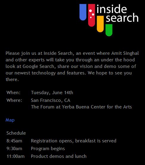 Google приглашает западных отраслевых журналистов на мероприятие «Inside Search», которое пройдет в будущий вторник, сообщает редакция Searchengineland, получившая аналогичное приглашение.