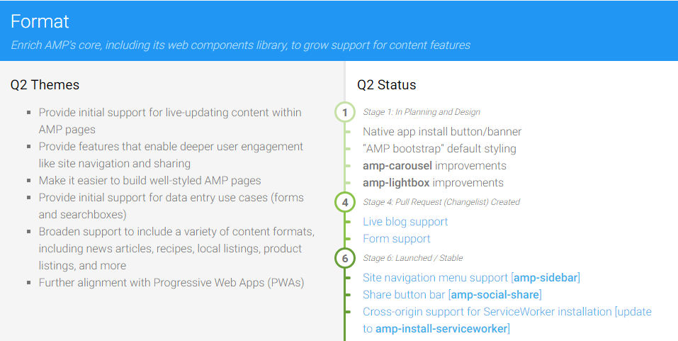 | | Планы Google по развитию проекта AMP стали доступны всем желающим. Указанный документ описывает все нововведения, планируемые к реализации, и ожидаемую дату их внедрения. Задачи разбиты на 4 основные категории - "формат", "Аналитика", "Реклама" и "Доступ". Всего с момента релиза AMP проект претерпел более 100 изменений.