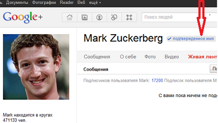 Google начал добавлять к некоторым аккаунтам Google+ значок успешно пройденной верификации. Первоначально значок выглядит как маленьких серый чекбокс округлой формы, но при наведении мыши он вытягивается в надпись “verified name” («подтвержденное имя»). Так, например, выглядит, значок на аккаунте Марка Цукерберга.