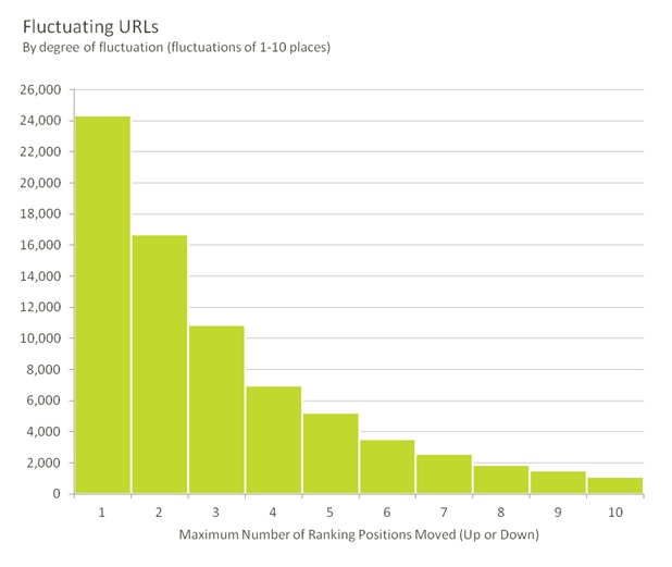 Компания Greenlight провела колебаний позиций в выдаче Google в течение суток. В исследовании была сделана выборка из одной тысячи запросов, в течение суток сохранялась выдача по 100 первым позициям (10 страниц) в выдаче – 10-15 раз. Благодаря этому удалось собрать базу около 1 млн. урлов и проследить, как менялись их позиции за этот период (эксперимент начался и закончился вечером).