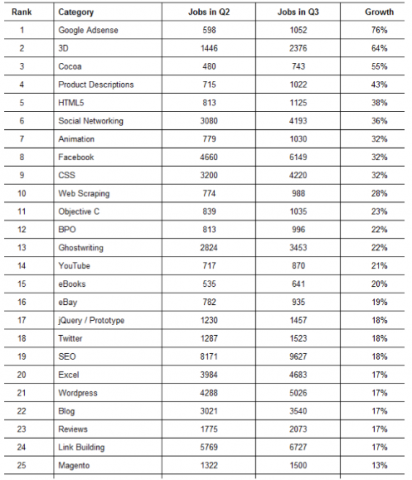 Особенно острой оказалась потребность в специалистах по Google Adsense (после запуска алгоритма Панда и падения позиций многие сайты задумались о контекстной рекламе) и HTML 5. Также увеличился спрос на аутсорсеров, работающих в сфере социальных медиа, причем раскрутка в Facebook выделена как отдельная специализация.