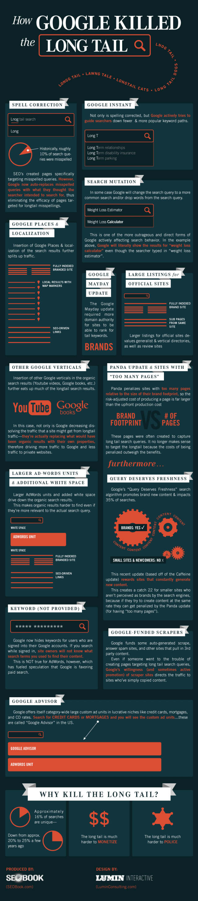| | Известный эксперт SEO-рынка Аарон Уолл опубликовал инфографику, которая показывает, как с помощью поисковых функций, которые вроде бы упрощают поиск для пользователей, Google последовательно убивает «длинный хвост» - низкочастотные запросы, состоящие из 4 и более слов. Итак, следуя инфографике, Google вводил следующие изменения: 1. Автоматическое исправление опечаток. Исторически около 10% запросов, которые вводили пользователи, содержали опечатки и ошибки. Оптимизаторы создавали страницы, специально заточенные под такие неправильные запросы. Теперь Google автоматически предлагает выдачу по исправленному запросу. 2. Google Instant – живой поиск, при котором поисковик не только предлагает поисковые подсказки пользователю (естественно, в числе этих подсказок самые популярные и конкурентные запросы), но и подстраивает выдачу моментально под каждый из этих запросов. 3. Замена запросов на «похожие», которую Google практикует в ряде случаев, тоже нацелена на то, чтобы предлагать более популярные варианты запросов. Например, вместо «weight loss estimator» выдача будет показана по запросу «weight loss calculator». 4. Апдейт Google MayDay, который прошел в мае 2010 года и нанес удар по сайтам с большим количеством страниц, заточенных под конкретные «длиннохвостые» запросы. После этого апдейта Google стал отдавать предпочтение более брендовым сайтам, отобрав у многих других сайтов трафик по «длинному хвосту». 5. Алгоритм «Панда», первыми жертвами которого стали сайты со «слишком большим» количеством страниц, которые чаще всего создавались как раз, чтобы собрать трафик по «длинному хвосту». 6. Алгоритм Google Fresh, по мнению Аарона Уолла, тоже мешает обычным сайтам получать трафик с «длинного хвоста», потому что данный алгоритм скорее помогает крупным информационным сайтам с регулярно обновляемым контентом получать этот трафик, если же обычные небольшие сайты пытаются так же часто обновлять у себя контент, они могут попасть под фильтр «Панда» за «слишком много страниц». Такая вот интересная ситуация. 7. «Not provided» - это нашумевшая инициатива Google по шифрованию запросов с органического поиска, из-за которой оптимизаторы стали получать меньше информации о конкретных запросах, по которым их находят пользователи. 8. Аарон считает (хотя это не является официально озвученной позицией Google), что поисковая система поощряет сайты, агрегирующие контент, фактически, это узаконенный копипаст и эти сайты отбирают еще часть трафика по «длинному хвосту». 9. Кроме того, автор инфографики считает, что в целом засилие в выдаче Google дополнительных сервисов компании снижает возможности для оптимизаторов получать трафик. Называются Google Places и локальный поиск, много дополнительных ссылок (sitemaps) для официальных сайтов брендов, ругие сервисы Google, такие как YouTube или Google Books. А также более крупные блоки спецразмещения Adwords и дополнительные отступы перед и после него, которые сдвигают основные результаты поиска вниз. Еще упоминается сервис Google Advisor, блок которого появляется над выдачей по запросам, связанным с финансами (ипотека, кредитные карты и др.). Если несколько лет назад доля запросов из категории «длинного хвоста» составляла в Google 20-25%, то сегодня эта цифра снизилась до 16%. Аарон Уолл считает, что последовательное снижение доли таких запросов связано с тем, что Google сложнее их монетизировать, конкуренция по ним 