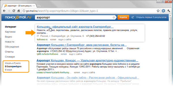 | | В поиске Mail.ru появилась возможность ограничить зону поиска определенным городом России. Как пишет в публикации на Habrahabr (что, заметим, весьма странный способ анонсировать новый поисковый функционал, обычно для этого используется официальный пресс-релиз компании) разработчик Поиска@Mail.ru Дмитрий Соловьёв, поисковая система извлекает из веб-сайтов информацию об адресе, таким образом осуществляя геопривязку ресурсов к региону. Благодаря чему пользователь может искать информацию по сайтам своего региона. При этом Mail.ru, в отличие от Яндекса, не меняет выдачу принудительно в соответствии с регионом пользователя, а дает возможность выбрать в настройках поиска один из вариантов: Искать в рунете, Искать в мире или Искать в… (город, в котором находится пользователь).  Как видно из скриншота, по запросу «аэропорт» Mail.ru предлагает пользователю такой выбор из трех вариантов. Отметим, что если пользователь находится за пределами России, по этому же запросу никакого города Mail.ru уже не предлагает, а следовательно, географическая карта городов для регионального поиска ограничивается пределами РФ. Дмитрий Соловьев в своем посте подробно описал механизм определения региона сайта, из чего становится понятным, что данная разработка действует за счет собственных ресурсов поиска Go.mail.ru, а не технологии Google, на которой в целом основан поиск Mail.ru. При заключении партнерского соглашения с Google представители Mail.ru неоднократно заявляли, что продолжают работы над собственной поисковой технологией и частично используют ее в комбинации с технологией Google. |