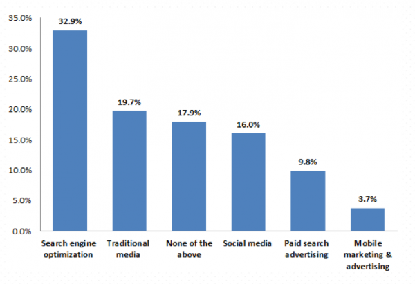 В предложенном списке самой популярной оказалась поисковая оптимизация сайтов (ее выбрали около трети опрошенных), на втором месте были традиционные медиа (19,7%), а контекстная реклама очень далеко от SEO – на пятой строчке по востребованности (9,8%). За социальные сети высказались 16% опрошенных.