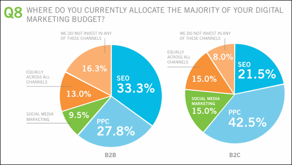 На вопрос о бюджетах треть B2B-маркетологов ответили, что SEO забирает большую часть бюджета. При этом 42% B2C-маркетологов заявили, что на PPC приходится основная часть маркетинговых расходов. Вдвое меньшая доля B2C-маркетологов назвали SEO главной статьей расходов.