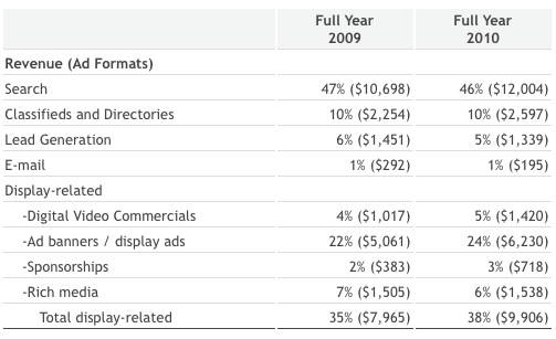 • Поисковая реклама в 2010 году заняла 46%-ую долю рынка и выросла на 12% по сравнению с 2009 годом.