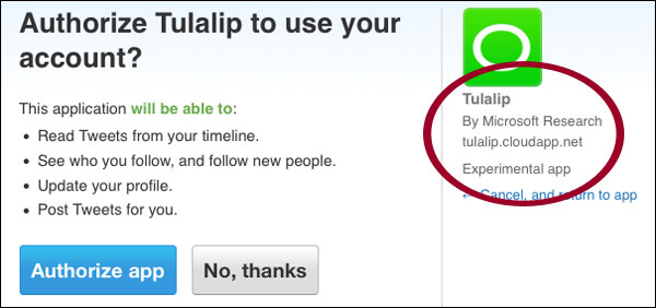 На странице также есть неработающие ссылки «Посмотрите, как это работает» ( “See how it works”), «Правила сервиса» и подобные. Также присутствуют кнопки авторизации в Facebook и Twitter. Между прочим, страница авторизации Твиттера подтверждает, что Tulalip – это экспериментальное приложение от команды Microsoft Research (см. скриншот).