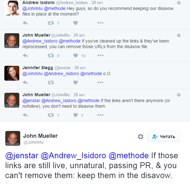 | | Джон Мюллер, специалист Google по качеству поиска, рассказал, что от содержимого Disavow-файла можно избавляться по мере устранения проблемных входящих ссылок. Как только вебмастер удалил ссылку или добавил nofollow-атрибут к ней, и поисковик проиндексировал изменения, нужды держать запись в Disavow больше нет. Об этом Мюллер написал в Twitter.