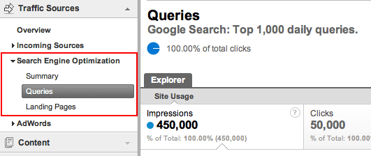 Отчеты, построенные на базе данных о запросах (Search Queries) из Webmaster Tools, появятся у тех, кто прошел регистрацию для участия в пилотной версии, под блоком Источники Трафика (Traffic Sources) в новой вкладке "search engine optimization".