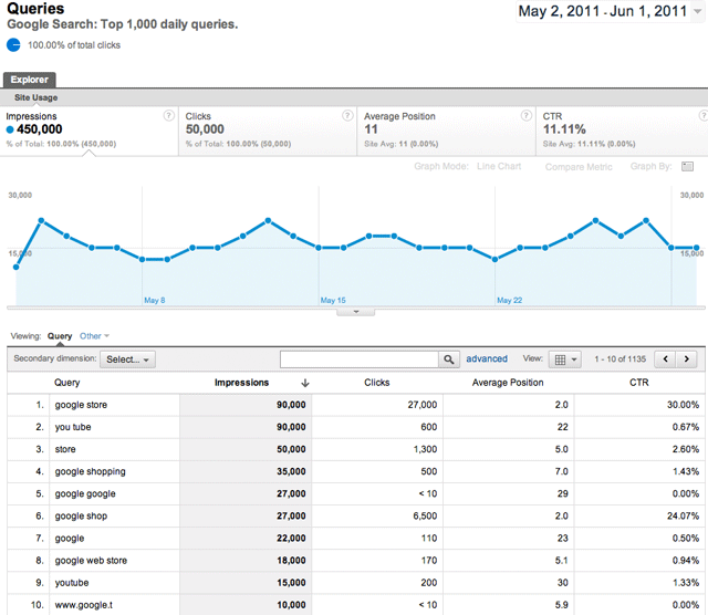 Полученные из Webmaster Tools в рамках Google Analytics можно гораздо глубже проанализировать – с помощью фильтрации и визуализации данных. В отчете представлены данные о запросах и целевых страницах – показы, позиции, клики и CTR.