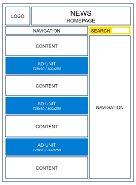 Ниже вы увидите два типа размещения рекламных блоков, которые Google называет безопасными для вебмастеров, вне зависимости от типа размещаемой рекламы. Google делает акцент на том, что реклама не должна смещать основной контент страницы во второе окно прокрутки.