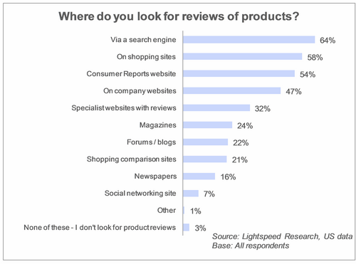 64% пользователей интернет за отзывами о товарах (особенно технике, одежде, машинах, DVD и пр.) обращаются в первую очередь к социальным сетям. Поразительно, но только 7% пользователей ищут отзывы с помощью социальной сети, как показало исследование Lightspeed Research.