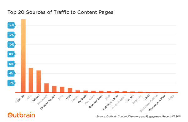 Не удивительно, что Google оказался главным источником тарфика на сайты сети Outbrain. Поисковый гигант приводит в 9 раз больше трафика чем в среднем любой сайт, ссылающийся на исследуемые. Главная страница AOL (т.е. портал, а не поисковая строка) приводит больше трафика, чем Yahoo и Facebook.