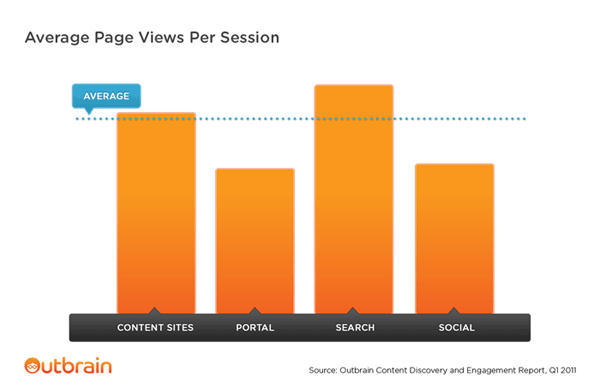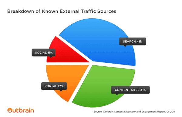 Оценивая трафик по 100 миллионам сессий за первый квартал этого года, Outbrain приходит к выводу, что поиск приводит 41% внешних ссылок, с других контентных сайтов пришли 31% посетителей, с порталов 17%, а с социальных медиа – тольо 11% общего трафикового «пирога».
