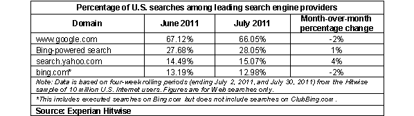 Поисковая доля Google и Bing в США за последний месяц несколько снизилась на фоне неожиданного роста доли Yahoo, которая превысила 15% (по данным Experian Hitwise за июль 2011 года).