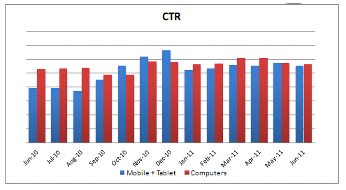 • По количеству кликов на контекстную рекламу, мобильные устройства получили 11.9% всех кликов (данные за июнь). Планшетники получили, в свою очередь 13.3% от всех кликов с мобильных устройств.