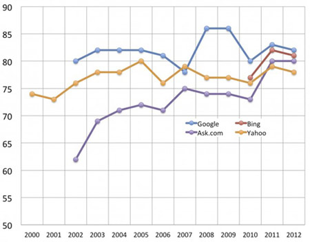 В рамках ежегодного исследования уровня удовлетворенности потребителей США (American Customer Satisfaction Index, ASCI) поисковыми системами выяснилось, что Bing уже второй год идет практически вровень с Google по баллам, при этом Ask.com тоже не сильно от них отстает.