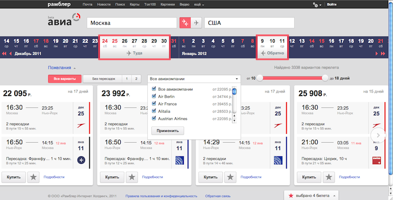 | | Руководство объединенной компании «Рамблер» и «Афиша» объявило о запуске ранее анонсированного сервиса для поиска авиабилетов. Сервис «Авиа» позиционирует своим преимуществом перед похожими поиковиками возможность искать билеты без указания точной даты вылета. Например, можно воспользоваться разделом «Когда дешевле» и указать, на сколько дней вы отправляетесь в путешествие. Сервис подбирает лучшие по цене предложения на разные даты. Как и запущенный ранее сервис Google Flights, Рамблер-Авиа не будет продавать билеты, а перенаправлять пользователей на сайты партнеров, такие как Pososhok.ru, Агент.ру, Anywayanyday.com, Sindbad.ru, Eviterra.ru, авиакомпания «Аэрофлот» и другие. По заявлению Рамблера, сервис будет хранить и обрабатывать данные о 200 млн. авиабилетов, что сделает Рамблер-Авиа самой большой базой для поиска авиабилетов в рунете. |