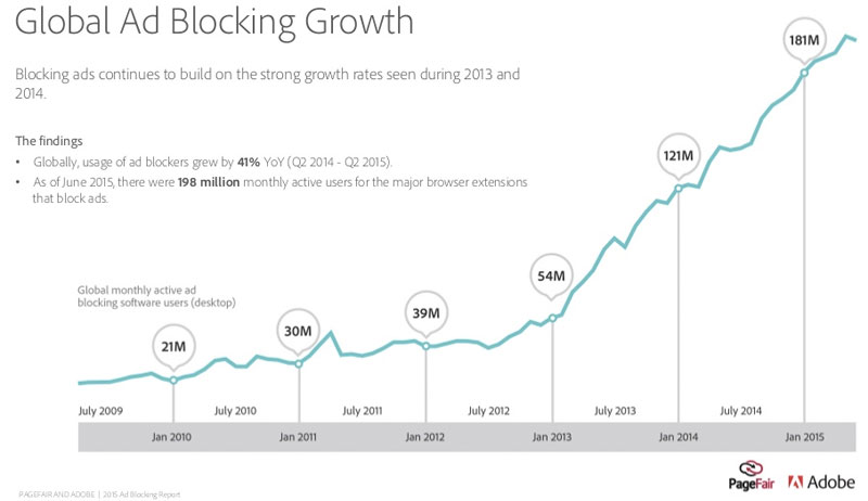 В 2009 блокировщики рекламы году были установлены на 21 млн устройств, а сегодня - уже на 198 млн: