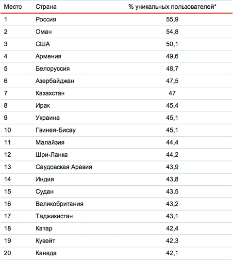 | | Россия по показателю опасности веб-серфинга заняла первое место в 2011 году, вытеснив прошлогоднего лидера – Ирак. В Ираке уровень веб-серфинга снизился до отметки в 45,4%, в результате чего страна по данному показателю опустилась на 8 строчку рейтинга. Оман занял 2 место, с процентным показателем 54,8%, а на третье место поднялись с пятой строчки США. В 2011 году помимо США в список развитых стран вошли Англия и Канада, что поменяло процентное соотношение развитых и развивающихся стран первой двадцатки.  В конце списка по данному показателю в 2011 году произошли самые значительные изменения. В группу риска перешли Германия, Япония, Люксембург, Австрия и Норвегия. В группу безопасных стран вошли все новые страны, кроме Дании, которая сохранила свою позицию в этом списке. Стоит отметить, что Россия находится на 2 месте по количеству доменов, с которых производятся атаки. В 2011 году «Лабораторией Касперского» было зафиксировано более 946,3 млн. атак, 14,6% из которых проводились с российских доменов. Эксперты лаборатории отметили, что второй год подряд главным оружием для атак являются эксплойты. |