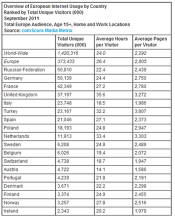 В сентябре 2011 года Россия впервые обошла Германию по количеству прользователей сети интернет, согласно последнему отчету компании ComScore. Теперь месячный показатель в России и Германии соответственно 50.8 и 50.1 млн. пользователей.