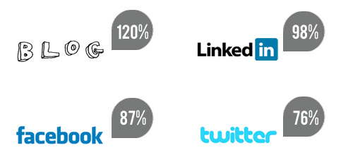 Также компаниям были предложены варианты социальной активности – блог, аккаунты в Facebook, Twitter и LinkedIn. Выяснилось, что самый высокий ROI у корпоративного блога (120%), а самый низкий – у Twitter (76%).