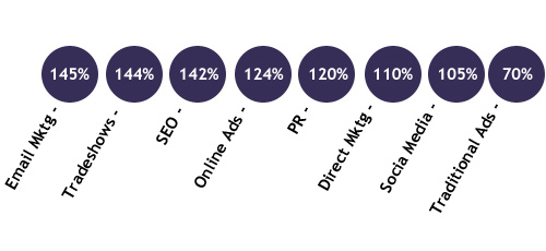 Отдельно стоит выделить такой критерий оценки маркетинговых направлений как ROI. SEO оказалось одной из тактик с самым высоким ROI, уступив лишь email-маркетингу и фирменным выставкам. 20% компаний заявили, что email-маркетинг и SEO позволяют им получить ROI выше 200%. Довольно странно, однако, что при таком высоком ROI, доля SEO в общих маркетинговых бюджетах технологичных компаний составляет лишь 13% (см. первую диаграмму).