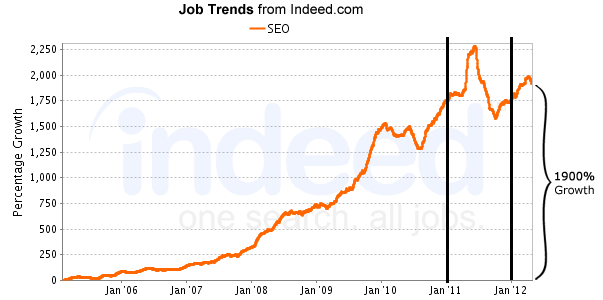 Однако стоит отметить, что на крупнейшем портале по поиску работы Indeed.com, судя по динамике появления SEO-вакансий, следует отметить, что спрос на этих специалистов упал в середине прошлого года, однако снова вырос к лету 2012 года.