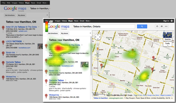Eye-tracking-эксперимент показал, что в региональной выдаче (Google Maps) работает классический «золотой треугольник» (распределение внимания пользователей на тепловой карте напоминает треугольник или латинскую букву «F»).