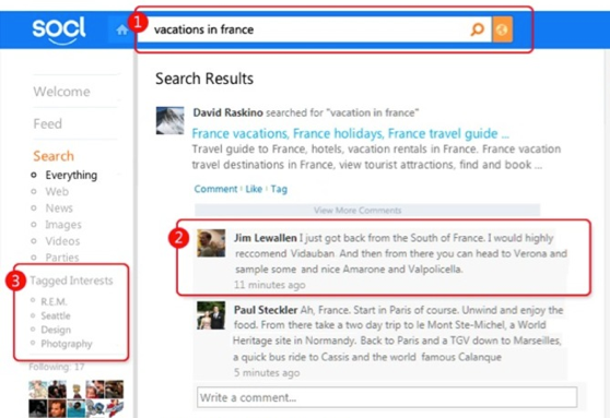 Те, кому удалось протестировать новый сервис, признаются, что его интерфейс немного напоминает Facebook. Поисковая строка находится там, где у Facebook – строка обновления статуса. А сама выдача Socl представляет собой копию ленты постов в соцсети, которую могут комментировать и читать друзья пользователя. На главной странице выделены три вертикальных колонки, инструменты навигации расположены в левом меню. Особо стоит отметить, что в сервис интегрирована социальная лента, отражающая активность пользователя и друзей из его списка контактов.