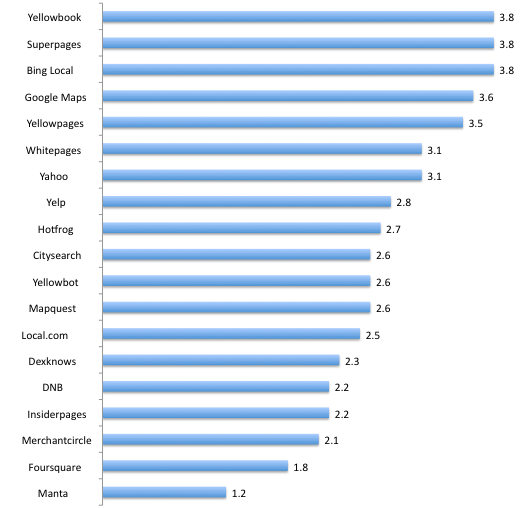 Однако если посмотреть на отдельные критерии, в некоторых из них лидировали другие сайты. Так, по полноте данных (больше всего из 1000 сайтов присутствовало в каталоге) лидировали Yellowpages/YP.com и Google. А вот в Foursquare с этой точки зрения данные были самыми неполными. Возможно, это объясняется тем, что Foursquare ориентируется в основном на определенные категории бизнеса (скорее на рестораны, чем, например, на сантехнические работы).